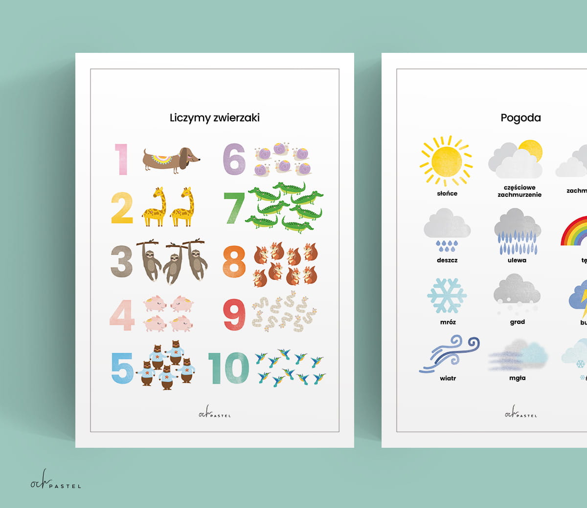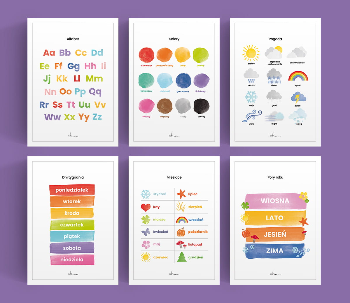 Kolorowe plakaty edukacyjne to świetna okazja do zmiany wystroju pokoju dziecka. Można zmieniać je co jakiś czas albo rozwiesić w kilku miejscach, by z zaskoczenia bawić się w wymienianie dni tygodnia albo pór roku. Przez zabawę do serca i głowy, taka jest najlepsza strategia dzisiejszego rodzica. Kupujesz plik z plakatami edukacyjnym — możesz wydrukować ich tyle, ile tylko chcesz.