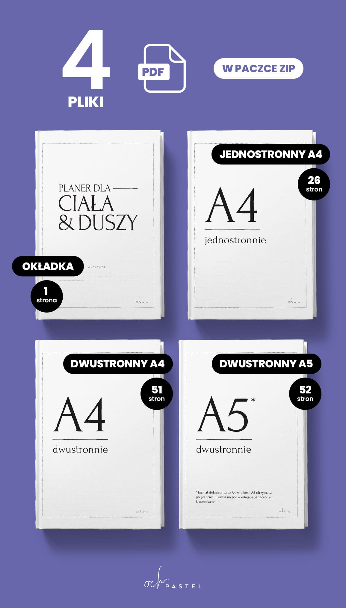 Karty planera są w spakowane w paczce ZIP, w której znajdują się pliki PDF, wszystko jest bardzo proste w obsłudze! Paczka zawiera 4 pliki PDF, w sumie mają one 130 stron.