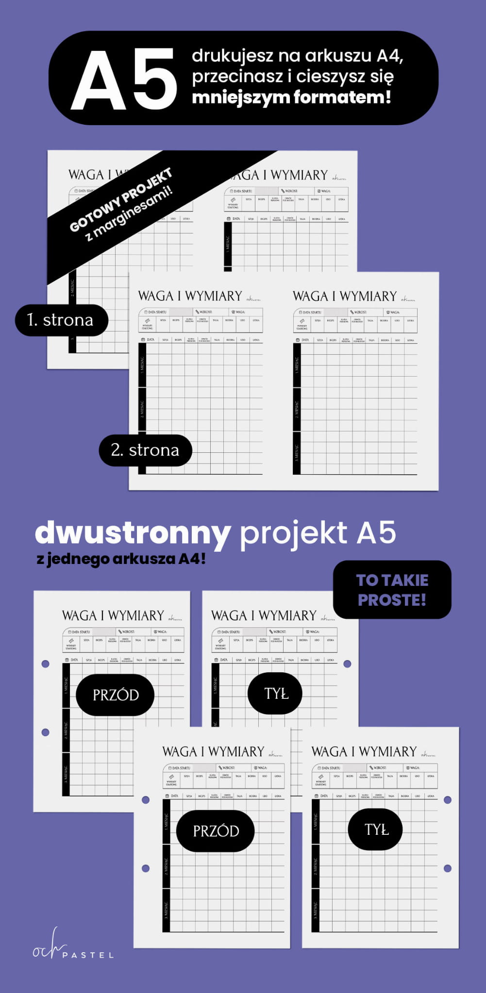 Spokojnie można drukować planer na domowej drukarce — wszystkie szablony są wielkości A4 jednostronnym, A4 dwustronnym i A5 dwustronnym (do wycięcia z A4).