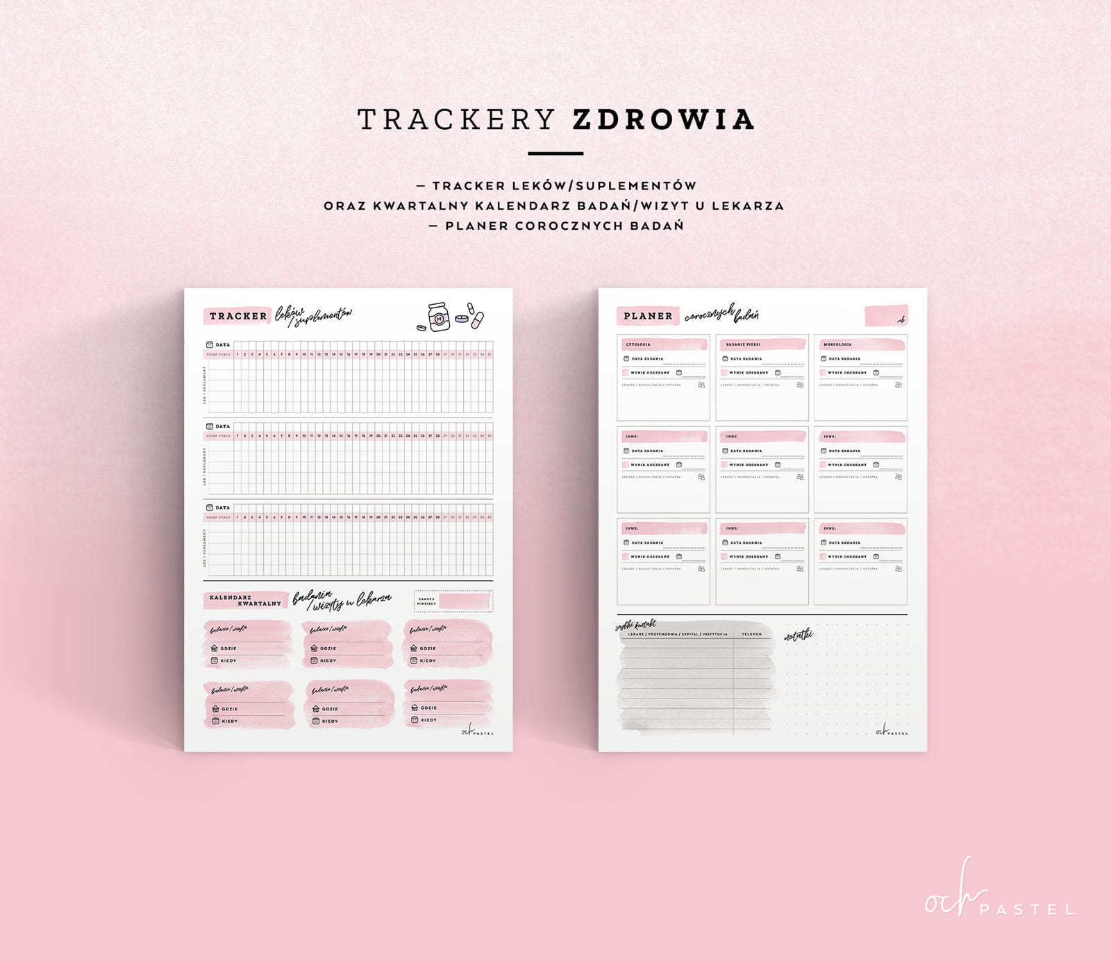 - 1 x tracker leków/suplementów wraz z kwartalnym kalendarzem planowanych badań / wizyt u lekarza