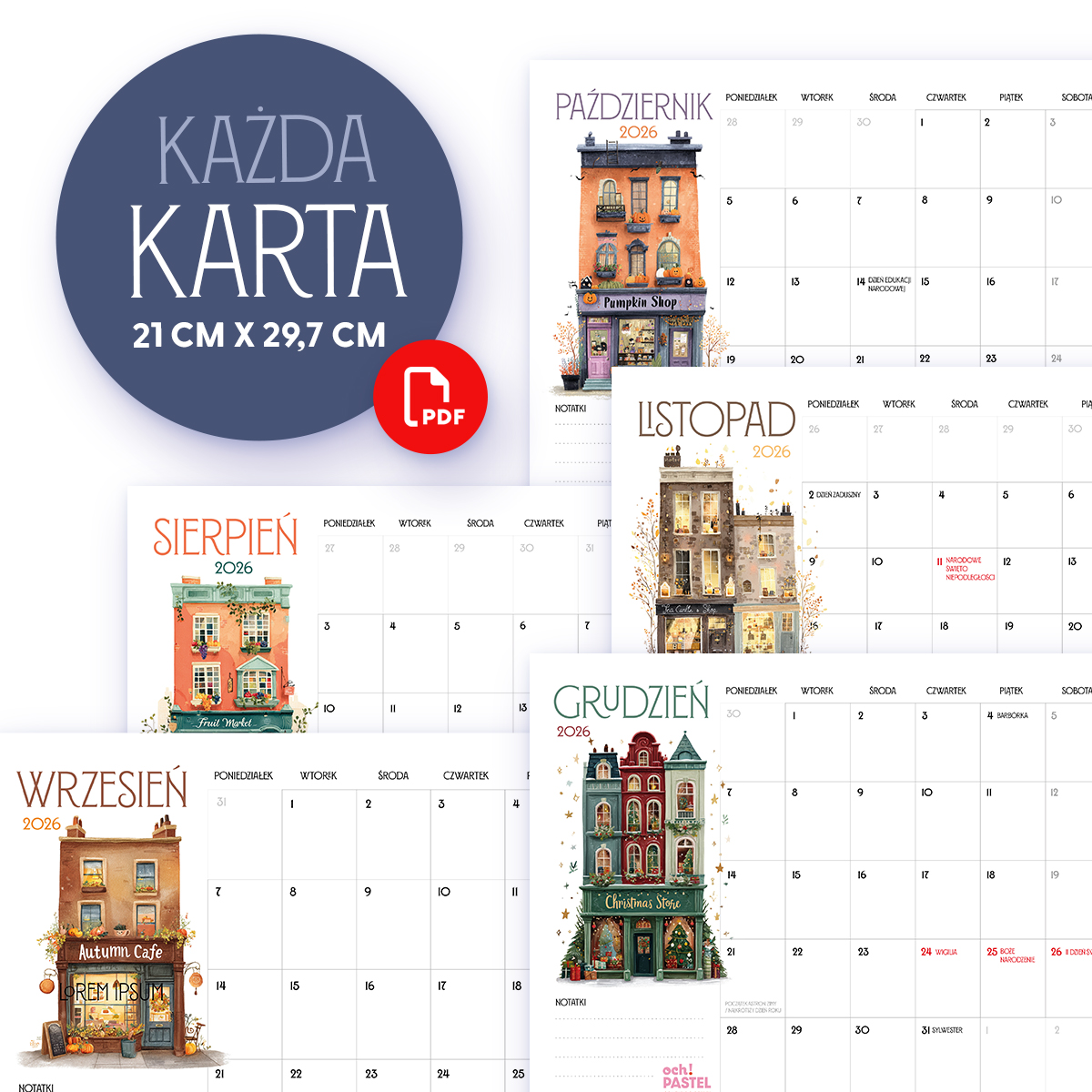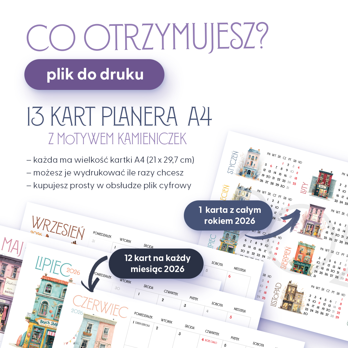 Planer 2026 do druku – Kamieniczki (PDF A4). 12 miesięcy w pięknym stylu, pastelowe ilustracje kamieniczek, czytelny układ z miejscem na notatki i oznaczonymi świętami. Plik do samodzielnego druku – praktyczny i estetyczny kalendarz na cały rok.